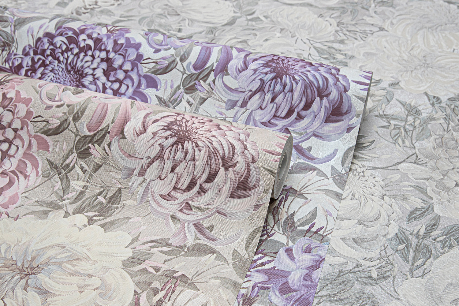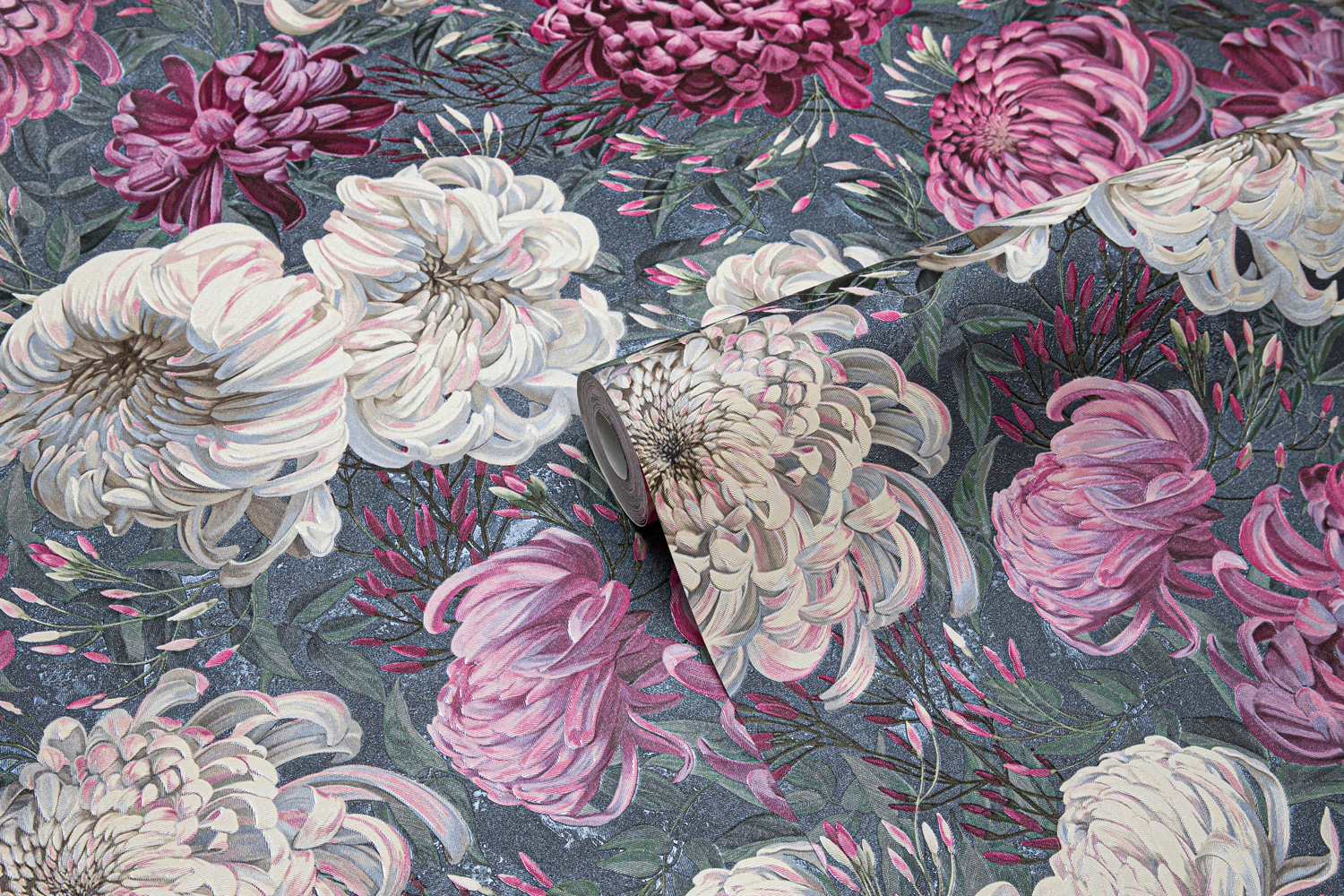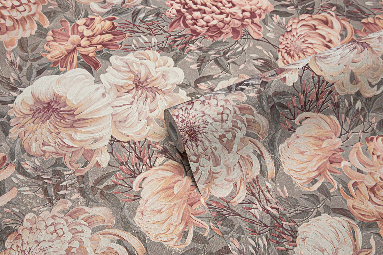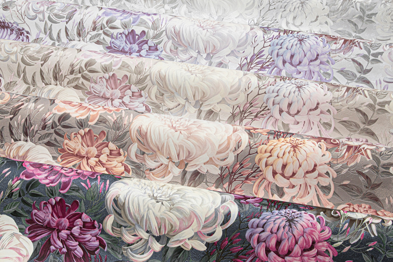 Универсальный масштаб рисунка и богатство деталей делают ХРИЗАНТЕМУ идеальным решением для акцентной стены. Пять мотивов и фонов открывают возможность выбора между нежным светлым колоритом с лавандово-жемчужными оттенками и глубоким серым фоном с едва заметным зелёным оттенком, на котором малиновые и пудровые соцветия звучат особенно насыщенно.