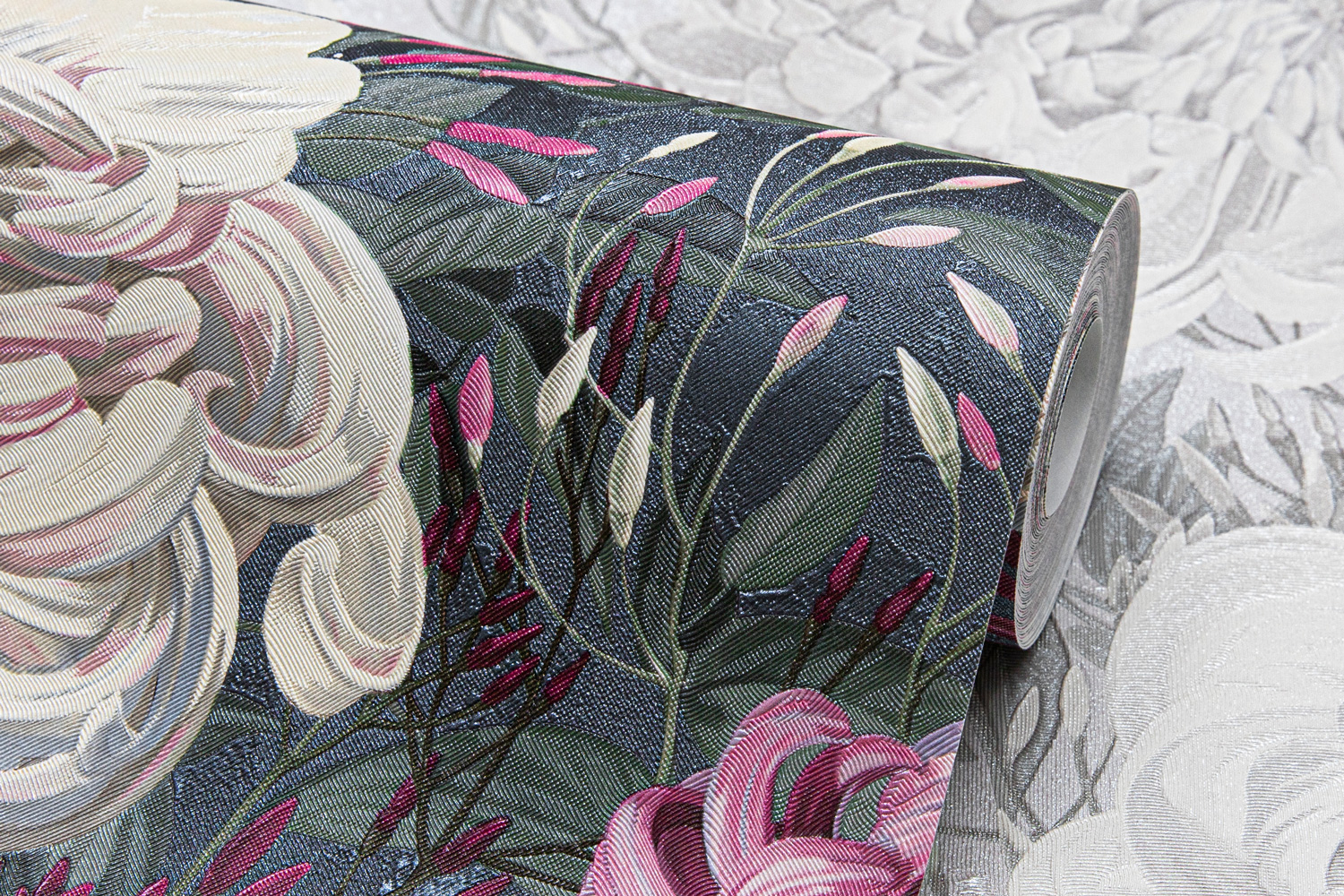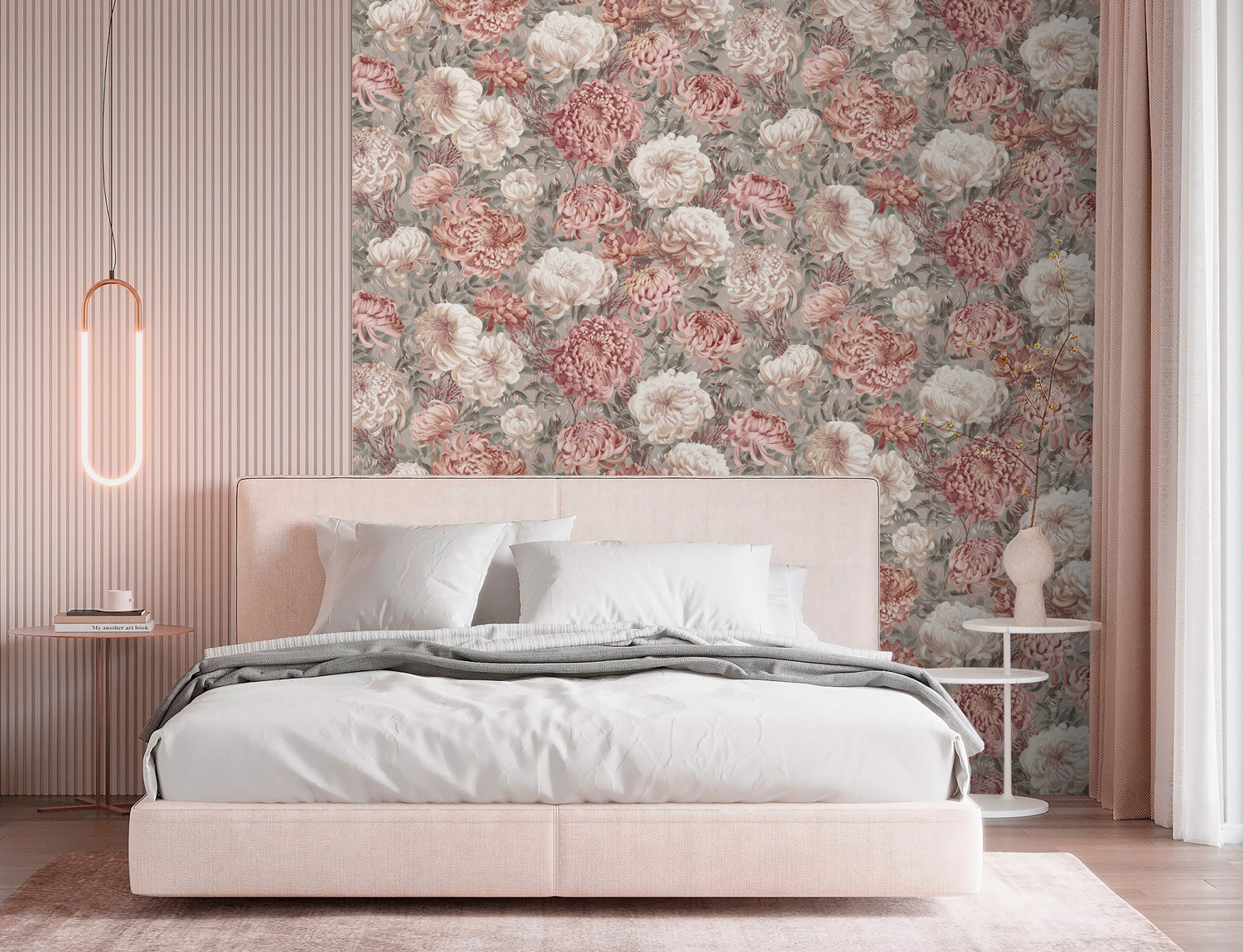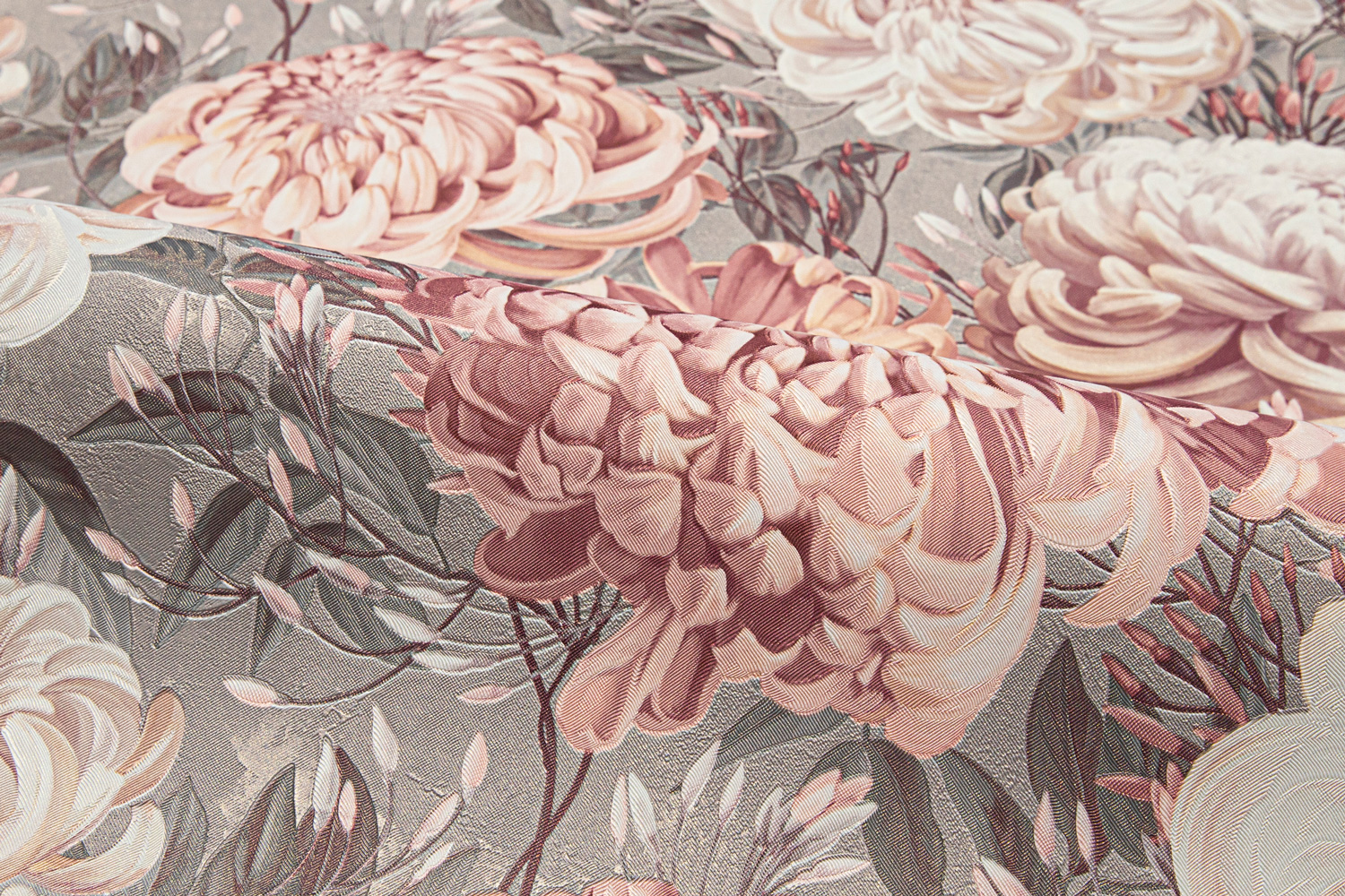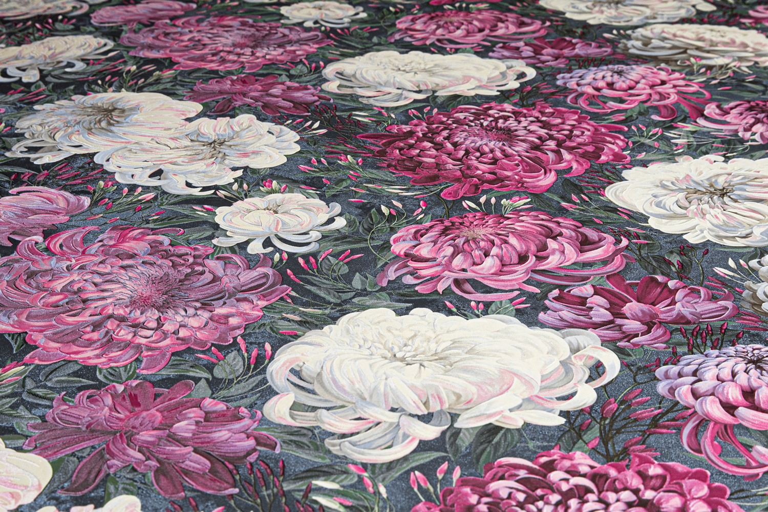 Универсальный масштаб рисунка и богатство деталей делают ХРИЗАНТЕМУ идеальным решением для акцентной стены. Пять мотивов и фонов открывают возможность выбора между нежным светлым колоритом с лавандово-жемчужными оттенками и глубоким серым фоном с едва заметным зелёным оттенком, на котором малиновые и пудровые соцветия звучат особенно насыщенно.